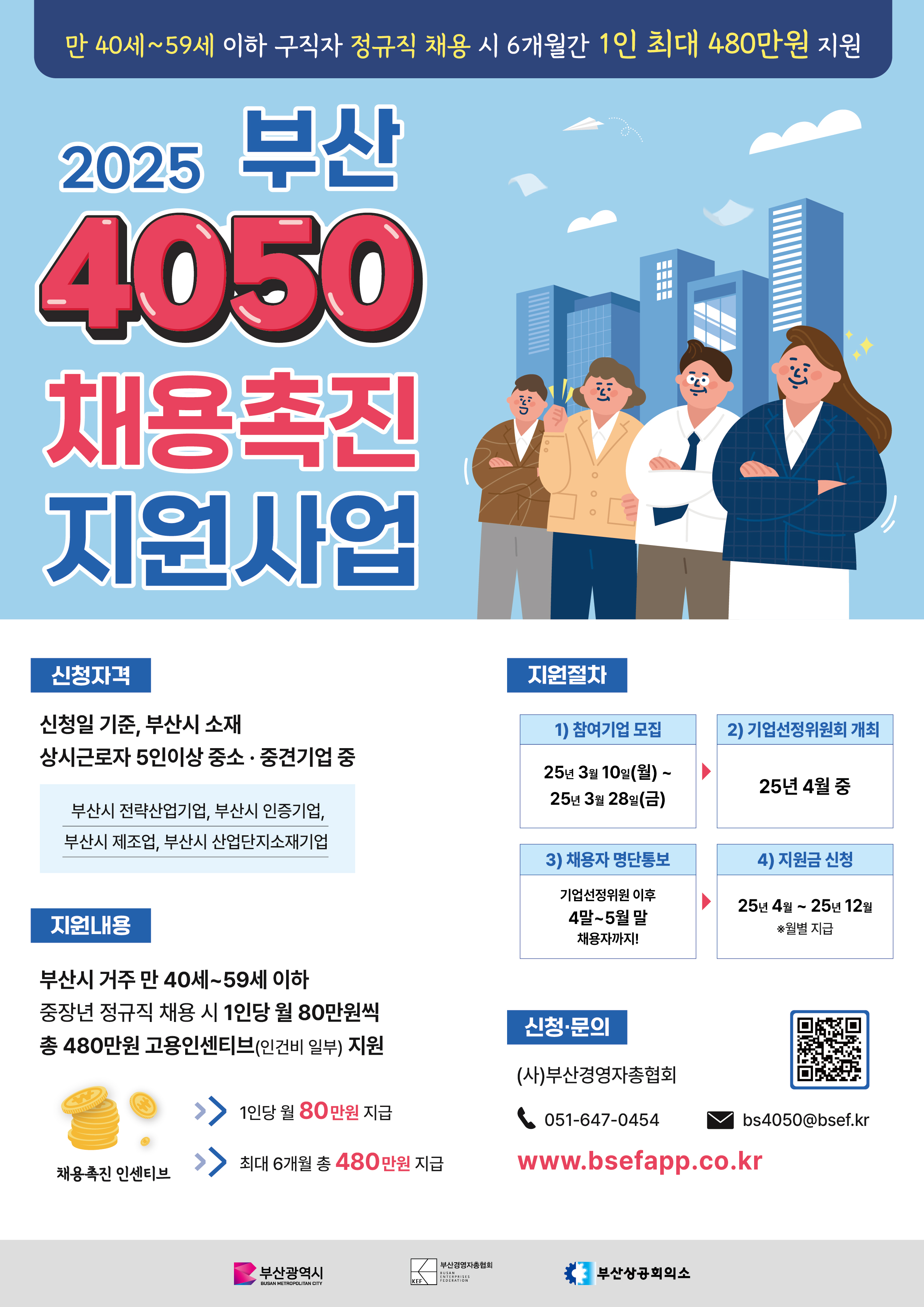 부산광역시와 (사)부산경영자총협회는 부산광역시 끼인세대 지원조례 제5조(지원사업), 부산광역시 일자리창출 지원조례 제 6조에 의거하여 부산 40.50대의 일자리 창출 및 고용안정 촉진 지원을 위해 노력하는 부산지역 소재 사업장에 재정적 지원을 하고자 「2025 부산 4050 채용촉진 지원사업」 참여기업 모집을 다음과 같이 공고하오니 많은 참여 바랍니다.